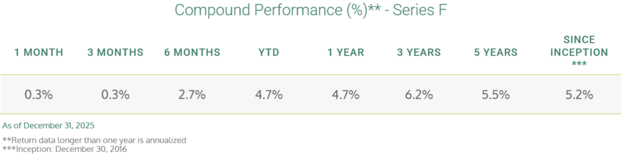Lysander-Fulcra Corporate Securities Fund (the “Fund”) returned 4.7% in 2025 (Series F). While credit markets were broadly constructive in 2025, the Fund’s return, despite a duration of approximately 2 years, was largely a function of cash income generation and select event-driven investments.